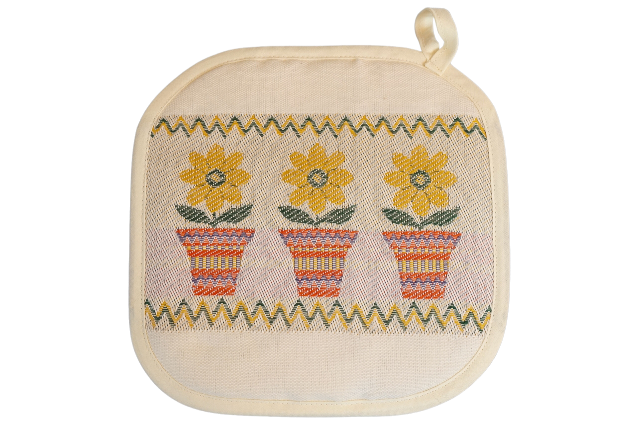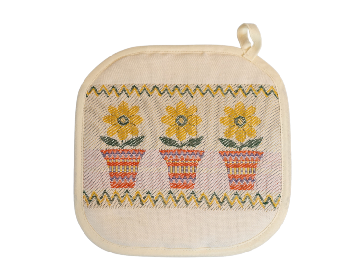Der Topflappen ist ein sehr nützliches Produkt für die Küche und wird oft als Dekoration auf der Küchenarbeitsplatte verwendet. Diese Topflappen aus Baumwolle (50%) und Leinen (50%) haben eine hervorragende Konsistenz und sind sehr waschbeständig. Sie passen gut zu unseren Geschirrtüchern und / oder Tischdecken. Sie sind mit einem Polyestermaterial gefüllt.