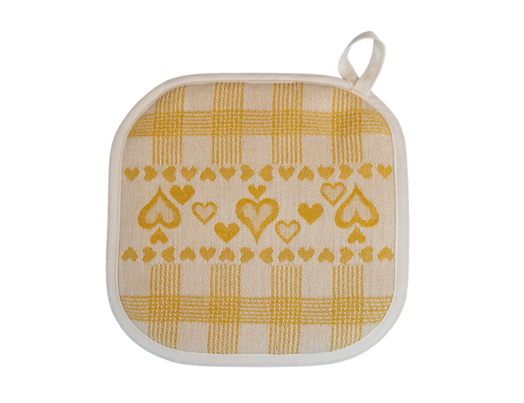 Der Topflappen ist ein sehr nützliches Produkt für die Küche und wird oft als Dekoration auf der Küchenarbeitsplatte verwendet. Diese Topflappen aus Baumwolle (50%) und Leinen (50%) haben eine hervorragende Konsistenz und sind sehr waschbeständig. Sie passen gut zu unseren Geschirrtüchern und / oder Tischdecken. Sie sind mit einem Polyestermaterial gefüllt.