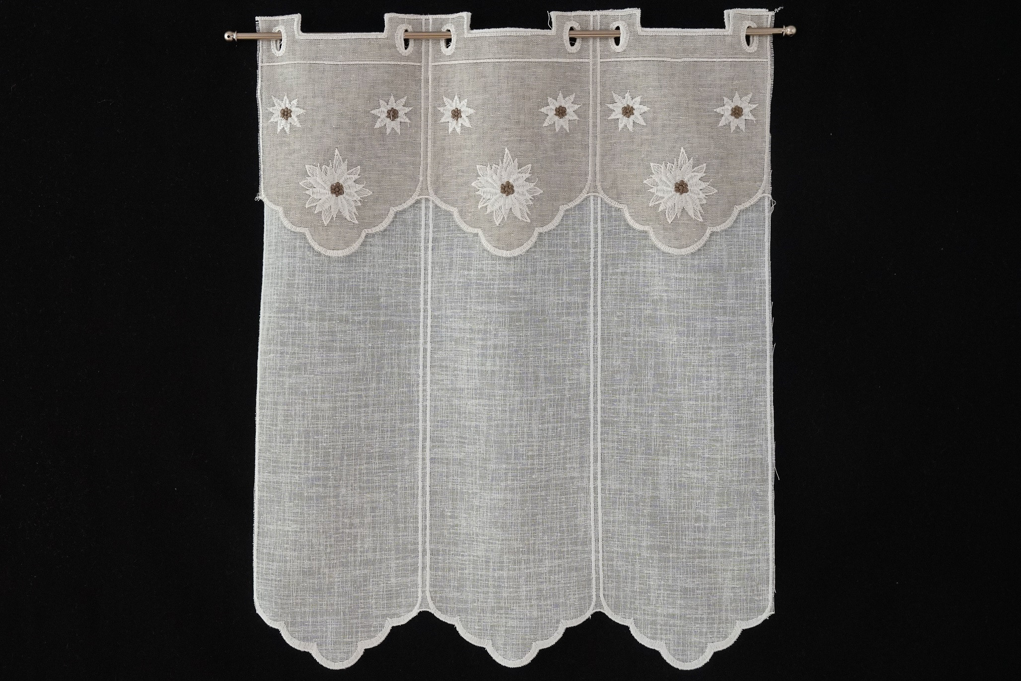 La tendina a vetro viene di solito appesa sulle finestre coprendo metà del vetro. Offriamo diverse soluzioni per appenderle e vi invitiamo a contattarci in merito. Questa tendina è disponibile in diverse altezze, mentre la larghezza può essere ordinata in base alla necessità di ogni cliente. la tendina presenta in alto un doppio strato includendo anche la mantovana dando un tocco più da montagna alla casa. La sua struttura a fasce ricamate rende facile il taglio e rifinitura della tendina. Nel caso si ordina una misura troppo grande, basta tagliare via le fasce di troppo e la tendina è subito pronta da appendere, senza dover cucire o rifinire il taglio. È adatta per qualsiasi ambiente casalingo.